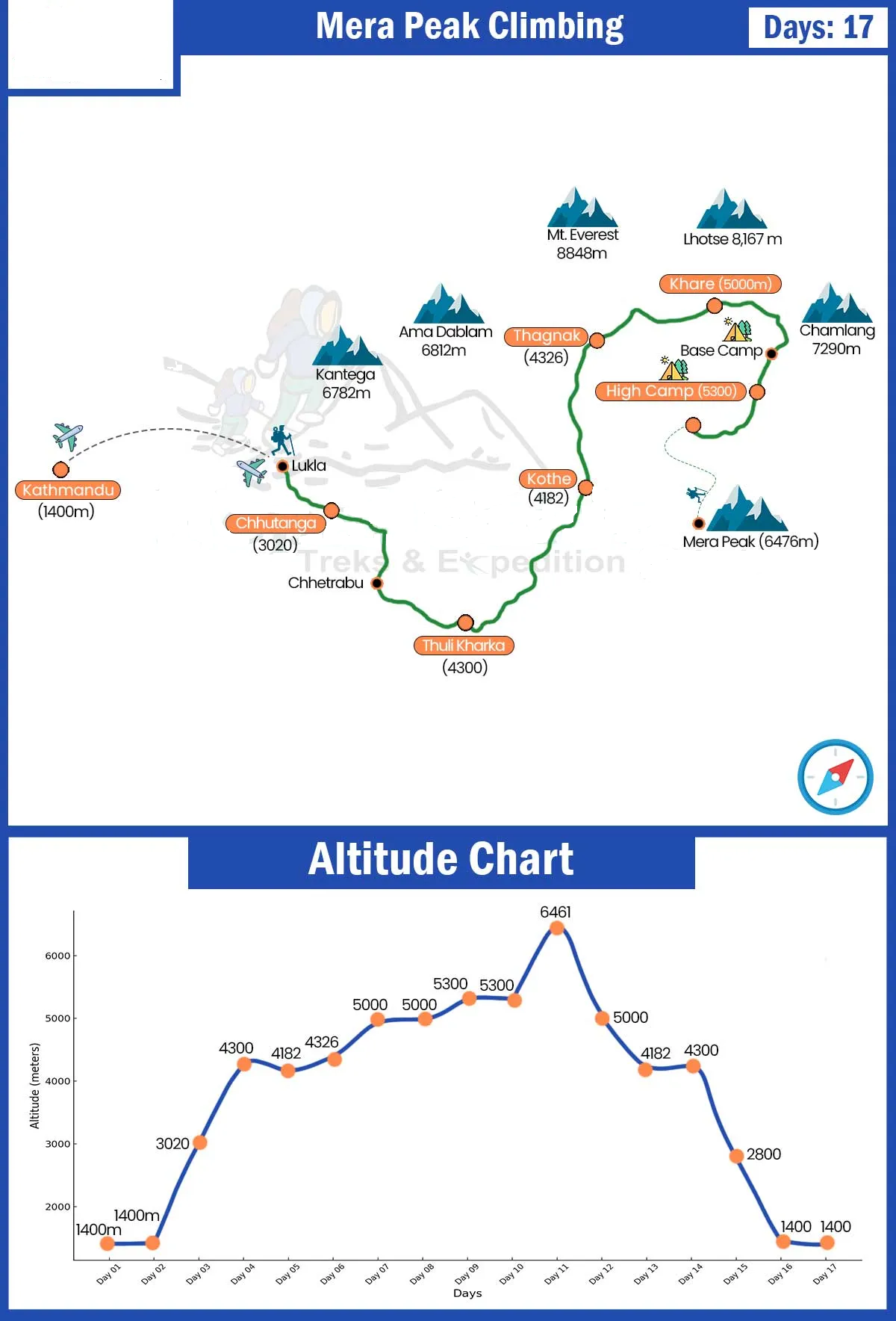 Начав свое великолепное приключение в Лукле на высоте 2800 метров (9186 футов), вы будете двигаться по восходящим тропам, преодолевая некоторые из основных перепадов высоты, такие как перевал Затравал (4600 метров), Тули Харка (4300 метров), Харе (5000 метров) и самой высокой точкой всей экспедиции — вершиной Мера-Пик на высоте 6461 метр (21 197 футов).